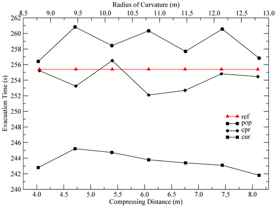 In Figure 6, the red line represents the reference configuration, pop represents the kinetic contour wall, cpr represents the linear compression wall, and cur represents the curvature wall. Analytical results show that compared with the reference configuration, the curved egression wall significantly reduced the evacuation time. The reduction in evacuation time was up to 14 s. The linear compression wall showed some improvement, but in some cases would even increase the time cost. The kinetic contour wall, however, performed disappointingly in every case. It would, in a real situation, prevent a crowd from escaping and in many cases increase the escape time.
