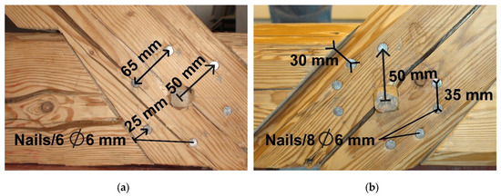 In the first case, energy dissipation capacity was increased by inserting mild steel rods (nails) around the wooden pin that connects the two parts of the halved joint, as shown in Figure 3a,b. No dismantling was necessary for this retrofitting intervention. The 6 mm diameter (D) nails were applied into pre-bored holes, which allowed for minimum spacing. When using six nails, the standard recommendations (10 × D along grains, 3 × D across grains) were observed. When using eight nails, due to the grain inclination, the distance along the grain was only 6 × D.