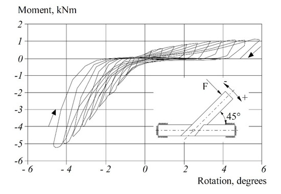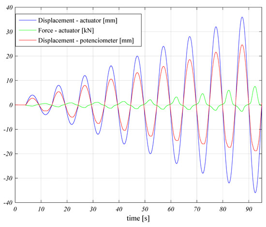 The specimens were cyclically loaded, and the load deformation curves were registered. The load was applied to the joint using the actuator attached to the oblique beam. The intensity of the actuator’s force was controlled by its prescribed displacement. The amplitude of the controlled displacement increased for each cycle, with a constant step equal to 4 mm. The frequency of each cycle was 0.1 Hz. During the tests, the forces needed to achieve the desired displacement of the cylinder and the change in the length of the potentiometer were recorded, as shown in Figure 7.