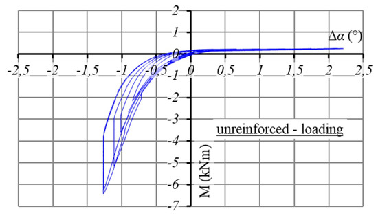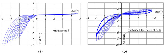 Both of the retrofitting methods tested (see Discussion) were effective from an energy consumption point of view. The results showing the changes in hysteresis loops after joint retrofitting are presented in Figure 8a,b, Figure 9, Figure 10 and Figure 11. Figure 8b clearly shows an apparent increase in the energy needed to achieve the required rotation (displacement), in contrast to the unreinforced joint, represented in Figure 8a. In this case, the cyclic loading continued after the maximum testing load was reached, following the stability of the response loop. A negligible change in the hysteresis loop was observed.