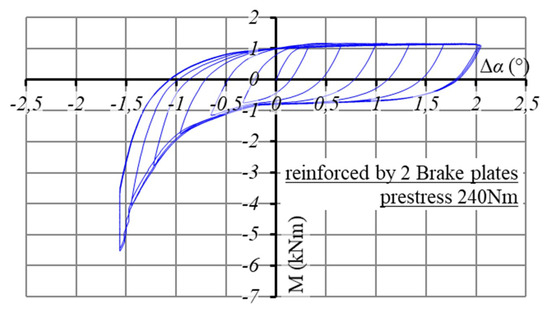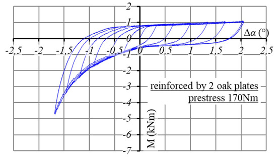 Similar positive effects were attained in tests with the inserted friction plates. A typical example of the behavior of a joint with two brake plates inserted in the gap between overlapping parts of the joined elements is shown in Figure 10. As shown in Figure 11, an almost identical dissipation energy was achieved with the two oak plates (Figure 11), even though the pre-stressing forces applied to the joining bolts were not identical.