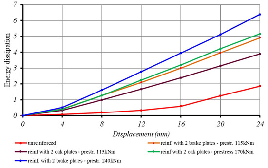 In the friction joints, energy dissipation depended on the forces pressing the two surfaces together. The resulting increase in energy dissipation, during cycling, of the tested joint retrofitting variations is shown in Figure 12. Comparing the results of the effect of two oak plates in relation to the brake plates—at an identical pre-stressing force—showed an obviously higher efficiency for the brake plates.