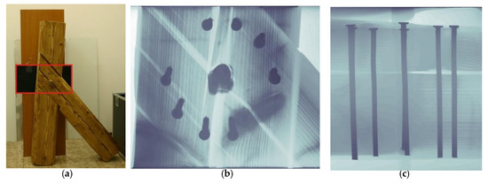 X-ray presentation of the deformed mild steel nails after the cycling tests of a joint: the (a) X-ray recording, (b) perpendicular view of the joint plane, and (c) cross-sectional view of the joint plane.
