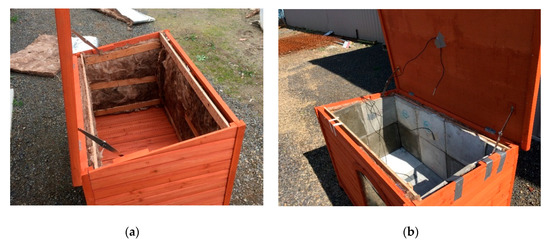 To assess the thermal performance of PCMCB as the interior surface element in buildings, the test huts must be chosen in a reasonable size, and they should be exposed to outdoor climatic conditions. On this basis, two identically sized test huts were built on a timber-framed structure with an inner volume of 1130 × 725 × 690 mm3. The floor and walls of the test huts were constructed on timber and fully insulated at its interior with 90 mm thick (R 2.0) glass wool insulation. The interior surface of the walls and floor were finished with test panels. A 400 × 400 mm2 double-glazing window was located on the east wall of the test huts through which solar radiation could enter. The window was made of two layers of 4 mm clear glass with an airgap of 10 mm. The roof was made of an R 1.8 insulation layer prefabricated by the manufacturer in between a 2 mm flat iron sheet (outside layer) and 10 mm thick timber panels (inside layer). Figure 2 shows the construction of test huts with the installation of insulation to timber walls followed by the PCMCB test panels as interior wall and floor elements. The detailed construction elements of the test huts are given in Table 2.