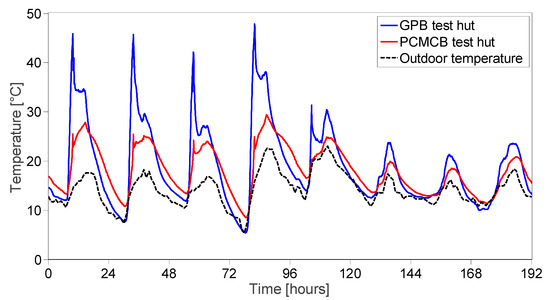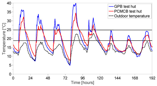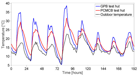 Indoor air temperature in GPB and PCMCB test huts (8–15 November 2016).