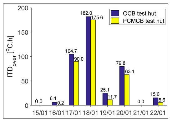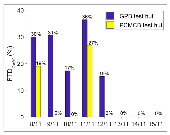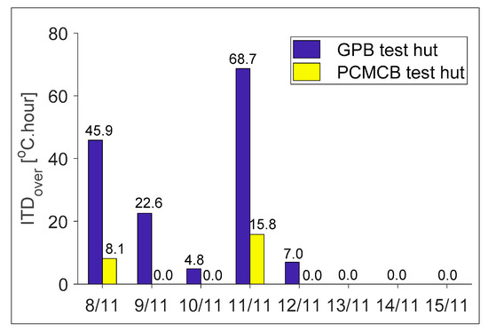 While the comparison of indoor and inner surface temperatures evidenced the improvement in thermal comfort conditions, the potentiality of PCMCB in reducing the overheating should be assessed. In this regard, the proposed indicators of ITDover and FTDover were assessed for the eight consecutive days and the corresponding results are reported in Figure 6 and Figure 7, respectively. From Figure 6, it can be seen that during the warmer days ITDover reaches up to 22.6 °C.h in the GPB test hut; the use of PCMCB completely offset the thermal discomfort due to overheating. On the very warm days of 8 November and 11 November, the PCMCB test hut reduced the ITDover from 45.9 to 8.1 and 68.7 to 15.8, respectively. The corresponding percentage reduction can be determined as 82% and 77%, respectively. This reveals that the replacement of modern lightweight construction material of GPB with the thermally enhanced PCMCB would have great potential in preventing the overheating during summer periods with the potential reduction in ITDover of up to 52.9 °C.h.