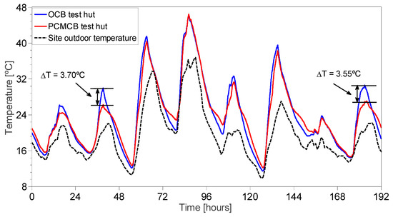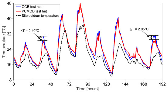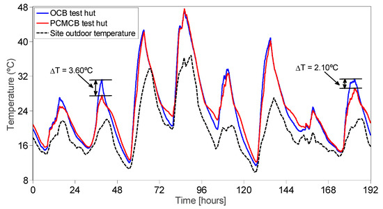 In this section, a comparison between the test huts made of OCB and PCMCB were compared. During the period 14–21 January 2017, the measured temperatures of the west wall, floor and indoor air are displayed in Figure 8, Figure 9 and Figure 10, respectively. When comparing the temperature measurements of the west wall and floor surfaces as shown in Figure 8 and Figure 9, respectively, the reduction in peak surface temperature was only significant on the first, second and eighth days. On these days, the maximum surface temperature reached in the OCB test hut was approximately 30 °C, which is adequate to thermally activate the PCM in the PCMCB test hut. Thus, the observed surface temperatures in the PCMCB test hut were significantly lower than the OCB test hut. During the other days, the peak surface temperature measurements were higher than 30 °C, and hence, the PCM was only effective for a short period and becomes ineffective once it is completely melted. Moreover, it was also observed that the minimum surface temperature of the PCMCB test hut was higher than the OCB test hut due to latent heat discharge of PCM. For example, the minimum wall and floor surface temperatures were increased by up to 2.2 ± 0.3 °C during this period.
