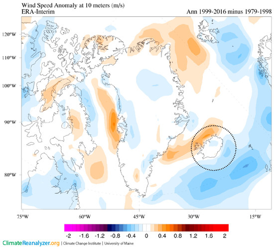 The ERA-Interim climatic model. The red color indicates a higher annual mean wind speed in recent years (1999-2016), while the blue color shows the opposite. Dataset source: https://apps.ecmwf.int/datasets/.