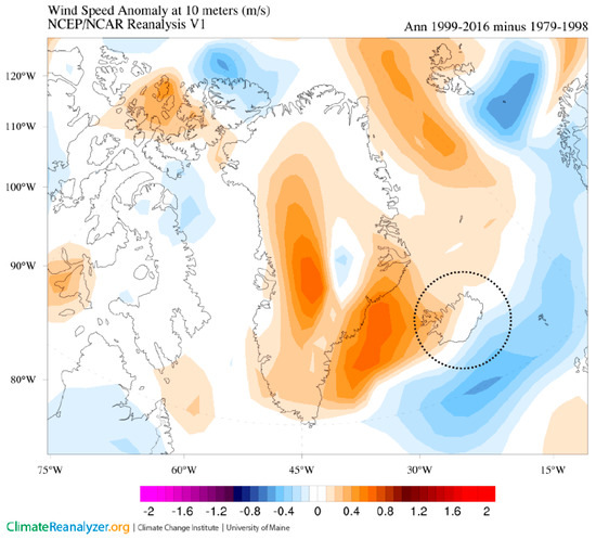 Firstly, we want to understand the climatic circumstances, particularly the wind situation in Iceland and the micro-climatic conditions in Reykjavik. Scientists use several types of climatic models for climatic data evaluation. Climate Reanalyzer is a free weather map web database, created by the University of Maine [24]. In this case study, the maps are used to find the correlation of two time periods of 1999-2016, and 1979-1998. The data are exported as images using two different climatic models, ERA-Interim and NCEP/NCAR Reanalysis VI (Figure 2 and Figure 3). The figures show the tendency of the wind speed at a 10 m height above the ground. Two selected climatic models interpret the changes with slight differences. Both of them, however, indicate higher wind speeds in the last years compared to the period from 1979 to 1998, at least over a part of Iceland. In this area, the strong wind is the most frequent weather phenomenon that often impacts airport operations [23]. Based on the known facts, we can assume a tendency of accelerating wind in this location. Nevertheless, the wind behavior is fluctuating and complex, and the predictions for the future development of the wind speed are even more unclear.