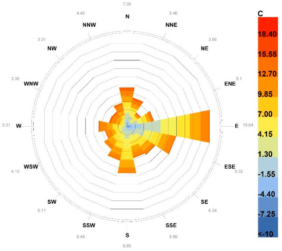 According to data from the EnergyPlus website, the average wind speed for all wind directions is around 5.89 m/s, which is only a slightly different value. This data source is hence chosen, due to its convenient usage in Grasshopper. The prevailing easterly winds are stronger than 5 m/s for 9.38% of hours per year. For all wind directions, the wind speed is higher than 5 m/s for 52.4% of hours per year. Moreover, the wind speed exceeds 15 m/s for 2.59% of hours per year, with the south-east direction encountering the strongest wind gusts. According to the Dutch Standard (NEN 8100: Wind comfort and wind danger in the built environment) that sets the threshold values for pedestrian wind comfort, if the value of 5 m/s is exceeded more than 20% of the time, the conditions for outdoor pedestrian activities are poor. If the wind speed is higher than 15 m/s for 0.3% hours per year, the conditions become dangerous [28]. The average wind temperature in Reykjavik is relatively low which contributes to the pedestrian discomfort in the outdoor environment (Figure 6). Only for 13.57% of hours per year is the temperature of the winds higher than 10 °C.