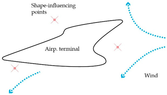 The parametric control of the design and the overall shape generation is performed by utilizing Grasshopper. The airport terminal’s shape is created from a single, closed planar curve. The shape formation is also dependent on ‘shape-influencing’ points, behaving as attractors. These core elements are variable and are designed and set at the beginning of the wind-influenced form-finding process, based on the knowledge of the site’s wind situation (Figure 7). The proposed parametric definition consists of the following main steps: