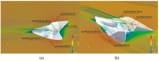 CFD results of shape variation 3: top view (a) and perspective view (b).