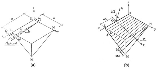 The methods proposed by these authors drastically limit the variety of the designed transformed folded shell forms to central sectors of right hyperbolic paraboloids [26] and their one-fourths [24,25]. Moreover, the models obtained by means of these methods enforce unjustified additional stresses of the folds resulting from the need to adjust the longitudinal axes of the shell folds to the positions of selected rulings of the hyperbolic paraboloid used. The above adjustment of the longitudinal shell fold’s axes to these rulings imposes a significant change in the width ΔM (Figure 5) [11] of the transverse fold’s ends passing along shell directrix LM. These additional forces cause a significant increase in initial stresses and limitation of the searched surfaces to shallow hypars.