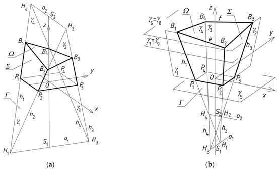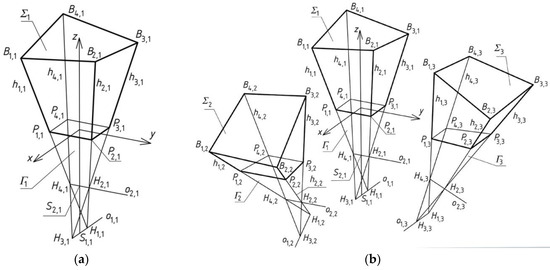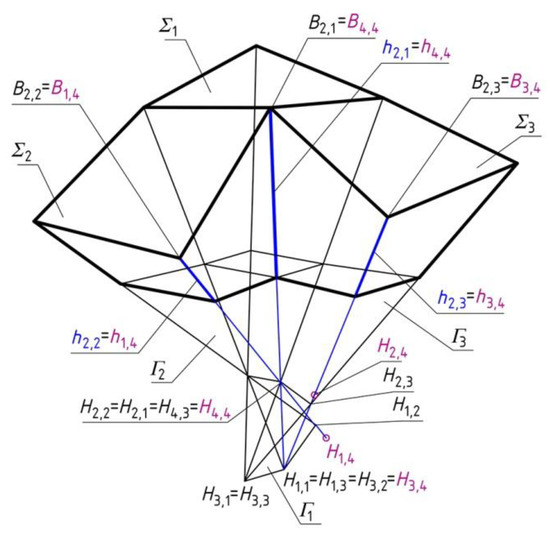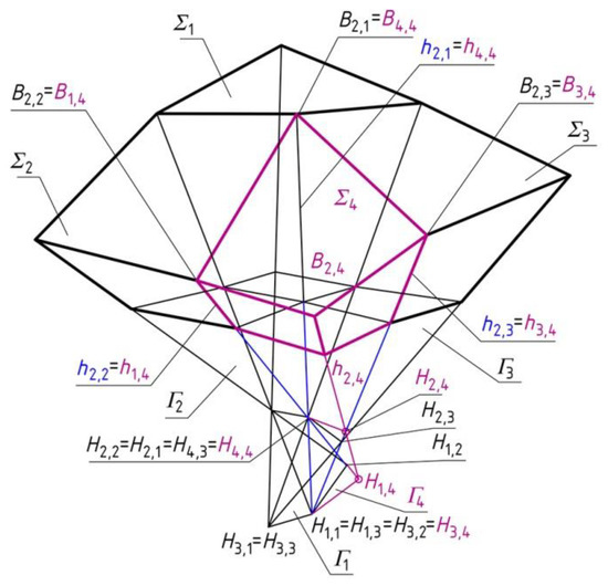 To obtain Σ4, vertices H1,4 and H2,4 are accepted at side edges h1,4 and h3,4 (Figure 10). It is assumed that B4,4 = B2,1, B3,4 = B2,3, B1,4 = B2,2. The position of B2,4 is determined at h2,4(H1,4, H2,4). Point P2,4 is the intersection of h2,4 and the base plane (x,y). The data used in the present example are given in Table 2 and Table 3.