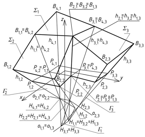 The transformation related to plane ξ2 of symmetry is denoted as L2, so H1,2 = L2(H3,1), B1,2 = L2(B4,1), B2,2 = L2(B3,1), Γ2 = L2(Γ1). In addition, B3,2 = B2,1, B4,2 = B1,1, P3,2 = P2,1, P4,2 = P1,1 and P1,2 = (H1,2, H4,2) ∩ (x, y) and P2,2 = (H1,2, H2,2) ∩ (x, y).