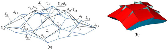 In addition, the following dependences should be adopted: B1,3 = B2,1, B4,3 = B3,1, P1,3 = P2,1, P4,3 = P3,1, B1,4 = B2,2, B3,4 = B2,3, B4,4 = B2,1, P1,4 = P2,2, P3,4 = P2,3, P4,4 = P2,1, H1,3 = H1,1, H3,3 = H3,1, H4,3 = H2,1, H3,4 = H3,2, H4,4 = H2,1. Other vertices are symmetrical towards plane (x,z) or (y,z). Thus, in order to obtain the entire reference structure Γ and free form structure Σ, four reference polyhedrons Γi (i = 1–4) and four free forms Σi have to be transformed towards these planes of symmetry (x,z) and (y,z) into new positions of Γr and Σr (r = 5–9). The final reference structure Γ and free form structure Σ, are shown in Figure 11.