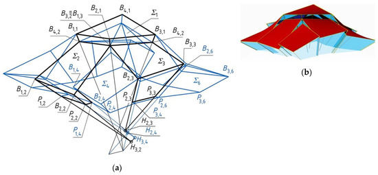 The second derivative form (Figure 13) is created as a result of: (a) the translations of all vertices of the eaves of Σ1 discussed earlier, along the relevant side edges of Γ1 in equal distances dh; and (b) the translations of the selected elevation side edges along the selected axes of the reference structure in the distances do1,2 = H3,2H1,1 = 4534.1 mm and do2,1 = H2,3H4,3 = 3126.7 mm, so that these side edges will be contained in the planes of control compositions Γ2 and Γ3. The values of the parameters used are as follows: B3,1B4,4 = B3,1 B2,1 = dh1,1 = 3000.0 mm. The values of the coordinates of the transformed vertices of the eaves are included in Table 5.