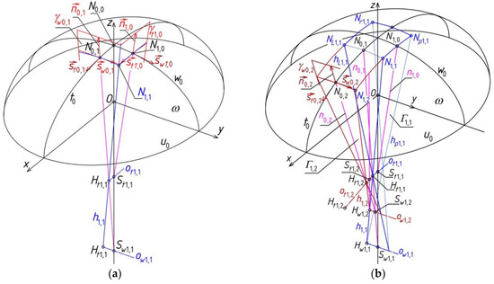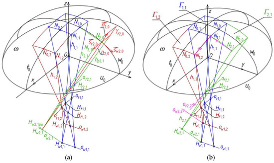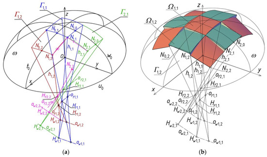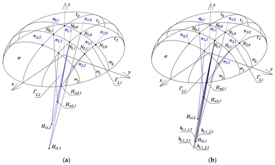 The structure created as a result of adding the reference tetrahedrons Γ1,1, Γ2,1, Γ1,2, Γ2,2 is not reference structure Γ because, similarly as for the case of the sum of tetrahedrons Γ1,1, Γ2,1 considered earlier, two triads of planes: ζtN1,2 ∘ ζwN1,2 ∘ ζwN2,2, ζtN2,1 ∘ ζwN2,1 ∘ ζtN2,2 and four planes ζtN1,1 ∘ ζwN1,1 ∘ ζwN2,1 ∘ ζtN1,2 do not have common side edges. Thus, tetrahedrons Γ1,2, Γ2,2 and tetrahedrons Γ2,1, Γ2,2 as well as Γ1,1, Γ2,1, Γ1,2, Γ2,2 do not have appropriate common side edges passing through point N2,1 or N1,2 or N1,1 (Figure 27b). Therefore, it is necessary to replace the above two triads and one tetrad with two new triads ζtN1,2n ∘ ζwN1,2n ∘ ζwN2,2n, ζtN2,1n ∘ ζwN2,1n ∘ ζtN2,2n and one new tetrad ζtN1,1n ∘ ζwN1,1n ∘ ζwN2,1n ∘ ζtN1,2n in such a way that the position of the new planes and their edges is close to the positions of the respective straight lines ni,j normal to reference surface σ with the most possible precision.