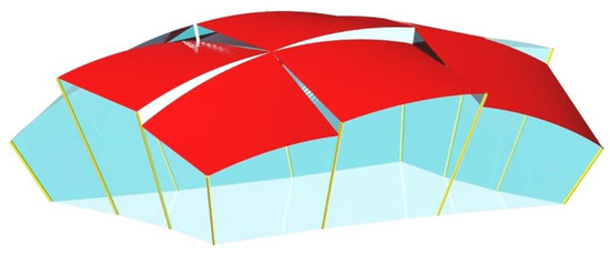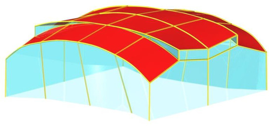 Simple shell structures composed of a few corrugated shells have been used in different architectural configurations, most often as shells supported by stiff constructions based on very few columns [27,28]. Shell structures are used for achieving: (a) large spans; (b) greater architectural attractiveness; and (c) skylights letting sunlight into the building interior [29,30].