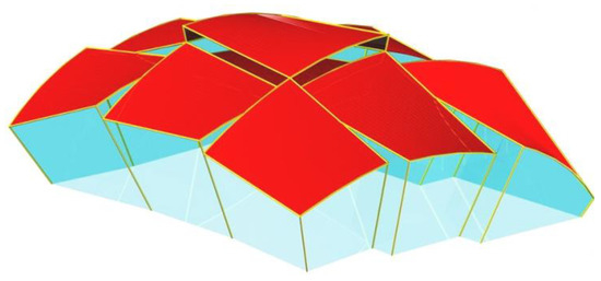 The free form presented previously is the basis of creating some derivative forms. The derivative free forms are shaped as a result of displacing or rotating some selected side edges of the basic free form in selected planes of its reference structure. The basic form is covered with the continuous shell structure (Figure 11b), whose individual shells are divided by shared edges locally disturbing the smoothness of the structure and forming a regular pattern on the roof. In addition, the elevations have relatively simple shapes.