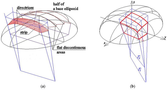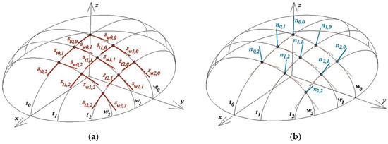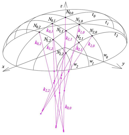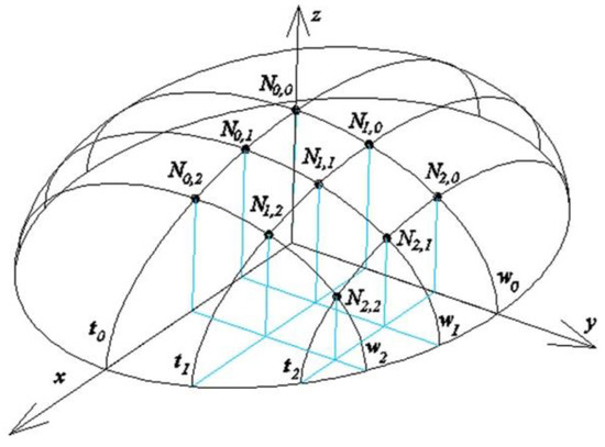 Using this method, it is possible to exploit specific geometrical properties of the reference surface, such as its planes of symmetry, so that the symmetry axes of the largest possible number of reference tetrahedrons Γi are contained in these planes. Moreover, relatively simple operations are possible to obtain the symmetry of quadrangles Bevi contained in Γi. In this method, however, reference tetrahedrons Γi are arranged on the basis of the reference surface in an intuitive manner to a large extent, whereby their construction is related to the curvatures of the reference surface only to a small extent. This may lead to unjustified differences in the shapes and irregular distribution of the reference tetrahedrons in relation to the reference surface, so certain additional rules are needed. Therefore, the author decided to employ some planes normal to the reference surface for selected planes of the reference tetrahedrons.