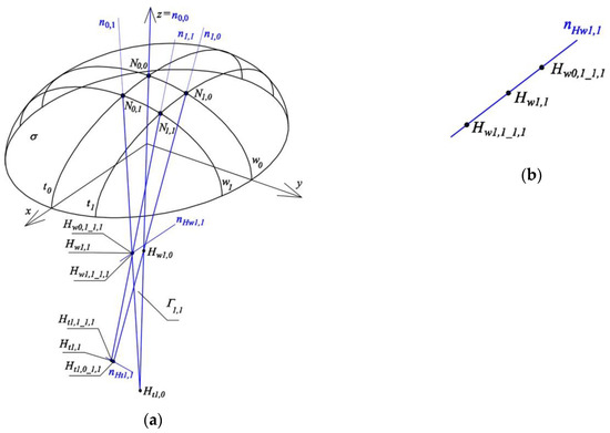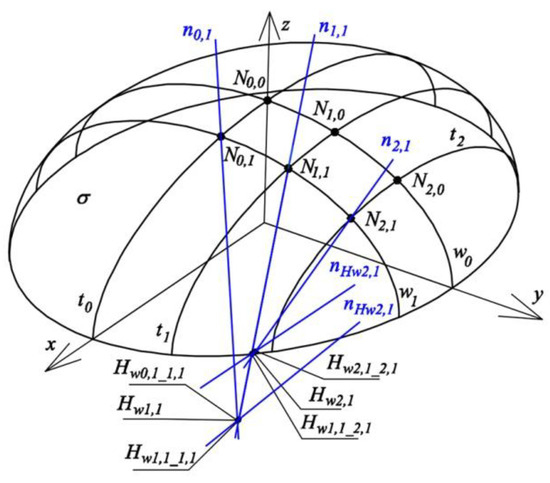 For the other two cases: {n0,0, n0,1}, {n0,0, n1,0}, both straight lines of each of these pairs are coplanar, and therefore these lines cross each other at vertices Hw0,0 and Ht0,0 of the reference tetrahedron Γ1,1, and it is not necessary to carry out relevant constructions. The notation of point Hw0,1_1,1 should be interpreted as follows: (a) symbol w indicates that this element is related to curve wj; (b) subscript 0,1 indicates that this point is referred to N0,1; and (c) subscript 1,1 means that the considered point is used for determining Γ1,1.