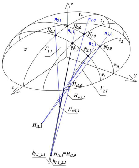 In turn, two planes: ζtN2,1, ζwN2,1 are defined respectively by the following triads of points: (N2,0, N2,1, Ht2,1), (N1,1, N2,1, Hw2,1), where Ht2,1 is the middle of section Ht2,0_2,1Ht2,1_1,1, and Hw2,1 is the middle of segment Hw1,1_2,1Hw2,1_2,1. Straight lines h1,0_2,1 = ζtN1,1 ∩ ζwN2,0, h1,1_2,1 = ζtN1,1 ∩ ζwN2,1, h2,0_2,1 = ζtN2,1 ∩ ζwN2,0, h2,1_1,1 = ζtN2,1 ∩ ζwN2,1 are initial approximations of straight lines nNi,j normal to the reference surface σ at points Ni,j (i = 1, 2, j = 0, 1) and are taken as preliminary approximations of the four side edges of tetrahedron Γ2,1. Each two subsequent straight lines from the four following lines {h1,0_2,1, h1,1_2,1, h2,0_2,1, h2,1_1,1} pass through adjacent points Νi,j of ellipsoid σ and intersect in the appropriate four vertices {Hw2,0, Ht2,0, Hw2,1, Ht2,1} of tetrahedron Γ2,1 (Figure 26).