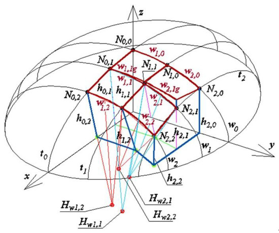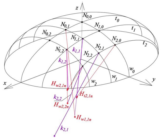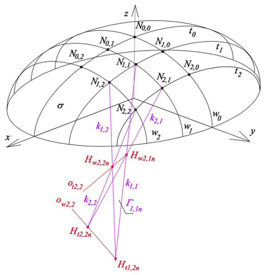 Points N1,1 and Hw1,1n define edge k1,1. Straight line k1,1 and point N0,1 determine plane ζwN1,1n of the reference structure Γn. Analogously, the following planes: ζwN2,1n, ζtN1,1n, ζtN1,2n of structure Γn pass through edge k1,1 and points N1,0, N1,2, N2,1, respectively. Similarly, plane ζwN2,2n passing through points N1,2, N2,2, Hw2,2n is the plane of structure Γn. Edge k1,2 of structure Γn is the intersection of planes ζtN1,2n, ζwN2,2n. Edge k1,2 and point N0,2 define plane ζwN1,2n. Planes ζtN2,1n and ζwN2,1n intersect each other in edge k2,1. Plane ζtN2,2n is determined by points N2,0, N2,1 and Ht2,1n. Plane ζwN2,2n is determined by points N1,2, N2,2, Hw2,2n. Edge k2,2 is the intersection of planes ζtN2,2n and ζwN2,2n.