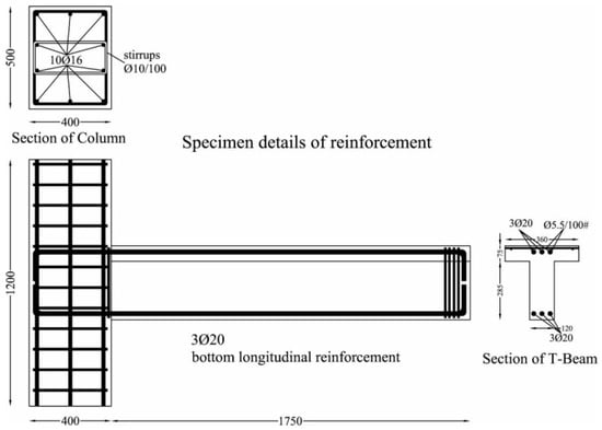 A total of seven reinforced concrete T-beams were tested under cyclic load in the experimental program. Dimensions and reinforcement details are shown in Figure 1. The cross-sections and conventional steel reinforcement details were identical for all specimens. Three 20 mm diameter steel rebars were positioned longitudinally at the top and bottom of the beam section. No stirrups were placed in the beams. The strengthening scheme consisted of high-strength steel fiber strips and a commonly used organic resin. Mechanical anchorages were used in four specimens. Table 1 summarizes the specimens’ properties.