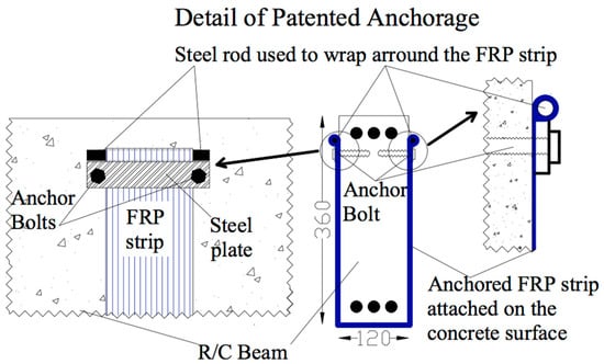 More specifically TB150P1b was strengthened with 100-mm-wide U-shaped SFRP strips spaced at 150 mm. Each U-shaped strip was anchored using a 20 by 5 mm rectangular steel plate secured with a 6-mm bolt. The mechanical anchor used in specimen TB150P1b is the easiest to apply and the most economical. TB150L2t was strengthened with 100-mm-wide U shaped SFRP strips spaced at 150 mm. Each strip was anchored at the bottom of the slab using a 50 × 50 × 5 mm steel angle. Two 8 mm diameter bolts were used to secure the strips. The bolts were positioned through the slab in order to avoid pull-out type failure of the anchors. TB200L1t was strengthened with 100 mm wide U shaped SFRP strips spaced at 200 mm. The strips were anchored at the bottom of the slab using a 50 × 5 mm steel angle. One 8 mm diameter bolt was used to secure the strips. Both bolts were positioned through the slab in order to avoid pull-out type failure of the anchors. This is a similar system to the one used in TB150L2t except that only one bolt was used in each steel plate. In addition, TB200P2b was strengthened with 100 mm wide U shaped SFRP strips spaced at 200 mm. For this specimen two layers of SFRP were utilized. The strips were anchored on the side of the beam just underneath the slab using the innovative device developed at Aristotle University of Thessaloniki. The device consists of a steel rectangular plate and a steel rod. More specifically, the SFRP strip passes under the plate and is wrapped around the rod. Finally, it passes again under the plate which is securely fixed onto the concrete substrate using two steel anchor bolts. The arrangement of the innovative anchoring device is depicted in Figure 2.