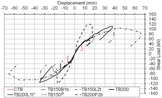 The highest recorded strains were obtained for specimen TB150L1t*. In this case, the maximum, average recorded strains exceeded 6500 μm/m. In contrast, the specimens that were strengthened with SFRP without the use of mechanical anchors, maximum strains were kept to significantly lower values (2500 με). This observation emphasizes that the use of mechanical anchors results in better utilization and performance of the strengthening material. Specimens TB150 and TB200 failed due to debonding of the SFRP strip, so the maximum recorded SFRP strain indicate values lower than the maximum effective strain. However, the recorded strain could be used to obtain shear performance related analytical expressions for the anchored SFRP strips (see Table 2).