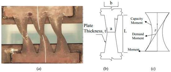 Structural fuses were recently proposed to concentrate damages and inelasticity at a specific part of a building, which saves the critical members from significant damages [,]. These fuses, in various shapes and sizes, allow inelastic displacement, by a yielding mechanism, in high drift ratios [,], which protect the surrounding members and improve the structural integrity under high seismic forces. A common type of structural fuse is made by the strategic removal of the material, leaving a structural fuse system in which the ductile mechanisms occur over the brittle limit states under shear loading [,,]. A typical structural element is a butterfly-shaped fuse, with linearly varying width, along the length of the link to efficiently equalize the demand and capacity moments. Figure 1 indicates a typical butterfly-shaped fuse system used in structural applications.