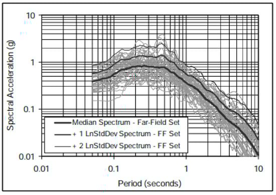 In this study, the effects of the seismic structural fuses system with butterfly-shaped dampers for multi-story structures are investigated and compared with conventional systems. Two systems are designed based on the Structural Engineers Association of California (SEAOC) manuals [,] for seismic investigation purposes. Incremental dynamic analysis is incorporated as one of the most efficient computational seismic analysis methods to perform the seismic assessment for understanding the behavior of structures. The seismic investigations are subsequently conducted by an incremental dynamic analysis study to indicate the collapse behavior under forty-four selected ground motions, based on accelerograms generating methodologies proposed by FEMA P751 [], and the advantages of the new structural fuse system over the conventional structures are shown in detail. The mean response spectrum of all accelerograms used for analysis purposes is shown in Figure 3. The record set is related to far-field, which does not include the vertical component of ground motion, since this direction of earthquake shaking is not considered of primary importance for collapse evaluation and is not required by the proposed methodology [] for nonlinear dynamic analysis.