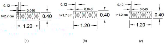 Three design groups used for incremental dynamic analysis (IDA) (thickness is in centimeters and the rest is in meters). (a) Category I, for lower story structural fuses based on W 10 × 68 beam dimensions; (b) Category II, for middle story structural fuses based on BU13 × 53 beam dimensions; (c) Category III, for upper story structural fuses based on BU 13 × 53 beam dimensions.