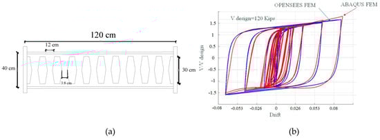 This verification study is conducted to investigate the OpenSees computation models and compare them with FEA results. For this purpose, two similar systems, schematically shown in Figure 7a, are modeled separately in each software and are subjected to the AISC 341 [] loading protocol for EBF systems. The computational modeling methodology is considered based on reference [], in which the butterfly-shaped dampers are modeled with a displacement-based beam element. The hysteretic results are compared and it is concluded that OpenSees models used for multi-story structure modeling have more than 98% accuracy in capturing the behavior of the butterfly-shaped shear dampers, which is shown in Figure 7.