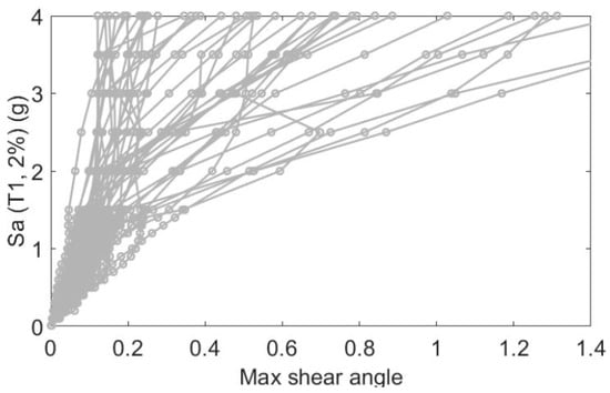 In this study, the structural response is the maximum fuse shear occurred under the applied ground motions. For each applied scaled ground motion, all the stories’ shear angles are monitored and the maximum shear angle, considering all the stories, is captured. Then, the peak ground acceleration, as the selected intensity measure, is derived and drawn with the corresponding maximum shear angle. Forty-four ground motions [] are selected and for each ground motion a total of 40 scale factors are applied.
