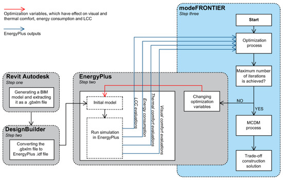 The methodology for using the above-mentioned incorporation in an office building followed three main steps. In step 1, a BIM model was generated using Revit Autodesk, version 2016. Revit improves collaboration and communication between professionals, and mitigates risks in construction practices [21]. Later, the BIM model was saved as a Green Building XML (gbxml) file. A gbxml file allows the transfer of building data among several architectural and engineering tools [21]. Step 2 involved the conversion of the gbxml file to an EnergyPlus Input Data File (idf) using the Design Builder simulation tool, version 5.0.3.007. Design Builder uses Energy Plus as a simulation engine to evaluate indoor comfort, energy demand, and life cycle costs [22]. The idf file was later modified using EnergyPlus version 8.5.0 and was prepared for performing an optimization. Step 3 related to the execution of the optimization and the selection of a trade-off construction solution using modeFRONTIER. An optimization algorithm was used to generate new designs by changing the value of the optimization variables and then iterating the simulation process. The iteration process continued until the maximum number of iterations were obtained. When the optimization process was terminated, an MCDM method ranked the optimization results to select a trade-off construction solution. Figure 1 shows a schematic illustration of the applied methodology in this study. Implementation of each step is thoroughly explained below.