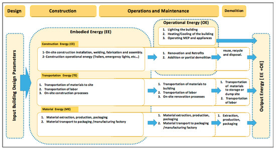 Energy efficiency and reduced carbon emissions in the built environment are highly sought objectives today. An estimated 40% of total energy consumption worldwide results from the building and construction industry [1]; therefore, the building sector is a significant contributor of carbon as well as other emissions [2]. Accounting for energy embedded in the building process is therefore critical to the optimization process. On a building level, the most commonly used mode of energy accounting in buildings uses either energy analysis or guidelines set by the ISO (International Standardization Organization) for life cycle assessment (LCA) [3]. Using LCA to determine the impact of a building on the environment involves accounting for and calculating all the energy processes involved in the production, maintenance, and demolition of the analyzed building. These processes are generally divided into two distinct categories: embodied energy processes and operational energy processes. The embodied and operational energies then sum up the total life cycle energy (LCE) of a building.