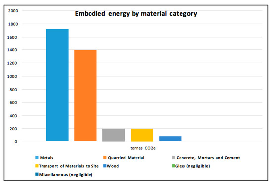 Limitations faced while conducting the case study included the absence of a tool specific to Egypt. Differences in geographic location signify differences in local materials, local production processes, and the amounts of carbon emitted in transportation and energy production. These differences result in carbon emission coefficients that differ from region to region and would therefore require tailored calculators that use regionally suitable coefficients. Emission factors tabulated by the ICE—Inventory of Carbon Emissions—are specific to processes and emissions in the U.K. This therefore indicates an expected inaccuracy in results when using the calculator for a building in the Middle East. Furthermore, among the inconveniences that were encountered while conducting calculations, reported quantities were rarely reported as a weight. Instead, reported quantities varied in units (square meters, linear meters) and in the number of individual units, all of which had to be converted to obtain the tonnage of materials used. Where sufficient specifications were not provided, realistic assumptions were made with regard to any missing dimensions. As paints were reported in term of surface area coverage, a standard assumption was made that every liter of paint covers an area of 12 m2. Regarding the sources of the materials, where clear reference to the origin of the material was not made and where re-tracing the specific origin of the batch of material on-site was not possible, an acceptable assumption was made from among a list of known places of import. Accordingly, steel was assumed to be imported from China arriving by boat through the Ain Sokhna Port. Aluminum was assumed to be coming in from a production facility 100 km North of Luxor, totaling a transportation distance of about 578 km to the site. Similarly, glass was assumed to be brought in from a production facility in Ain el Sokhna, which is 140 km from the point of origin.