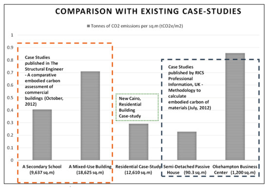 Compared to the higher operational energies in cold countries (as a result of more extensive heating loads), embodied energy holds a greater share of the LCE in hot and dry countries such as Egypt. As a result, embodied energy reduction in Egypt is of particular significance to the decarbonization of local construction. Furthermore, as discussed by Haynes [5], it is important to differentiate between embodied energy and embodied carbon. For example, while a comparison of embodied energies of two buildings might show that one has higher energy content than the other, energy content alone should not be considered as an indicator of its impact on the environment, as the building with higher embodied energy might use a clean renewable source, whereas the building with lower energy might be based on fossil fuels, having an overall greater environmental impact.
