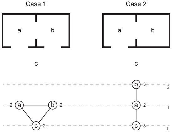 While computing all configurational possibilities for a four-vertex graph is feasible, as the number of vertices increases the number of options quickly becomes computationally unwieldy. An alternative approach is to construct an indicator for permeability based on global graph characteristics, such as the cyclomatic number c () [12] (pp. 189–191, 202–203), which counts the total number of closed faces in a graph (i.e. the number of rings that do not contain other vertices). The downside of a global graph measure is that it cannot measure the relative contribution of particular edges within the overall plan layout. Instead, we propose to quantify the permeability of a plan graph using vertex depth, which is the number of edges that need to be travelled to go from one particular vertex to another—usually a root vertex that has been singled out for analysis. In Figure 1, the plan graphs with root c are drawn under their respective plan layouts, with the distance from the root marked by grey horizontal lines; this type of drawing is a JPG. The Total Depth (TD) of a vertex—a measure used in JPG analysis—is the sum of its vertex depths to all other vertices in the graph. TD indicates how close or far a single space is to all other spaces, so the inverse of TD is a local measure of permeability. We then define Aggregated Total Depth (ATD) as the sum of the TD of every vertex, or the aggregated vertex depth from all vertices to all other vertices. In Figure 1, the fully permeable graph has an ATD of 6, while the linear graph has an ATD of 8. Rather than measuring a characteristic of the overall graph, ATD aggregates characteristics of individual vertices.