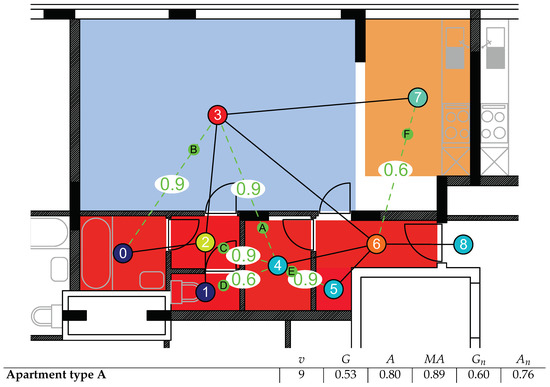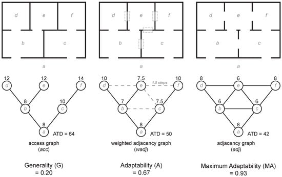 The Generality (G), Adaptability (A), and Maximum Adaptability (MA) of a plan graph are the Permeability of its access graph (acc), weighted adjacency graph (wadj), and adjacency graph (adj), respectively. For example, the Adaptability of the plan layout in Figure 2 is: