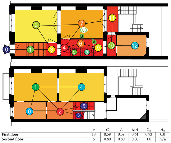 These provisional values only take into account constructional criteria. The list could be expanded to include, for example, functional and behavioural criteria, such as the current use of an adjacent space (e.g. whether a room is private or not), or criteria related to cost (e.g. whether a room houses specialised equipment or not). In future renditions of the method, we plan to implement a more elaborate framework to quantify wall permeabilities—e.g. refs. [31,32]. Both convex mapping and permeability weighting could be automated in a Building Information Modelling environment.