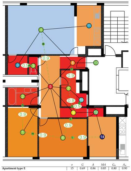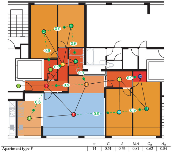 Apartment E (Figure 5) has the highest Generality of all the apartment types in the set (G = 0.69). All the spaces or functional clusters are connected to a neutral U-shaped hallway. Hence, spaces can be accessed independently, making the spatial configuration more permeable. Unit E is also the most Adaptable (A = 0.84). Because the kitchen, bathroom, toilet, and laundry have been directly connected to service risers, none of the nine potential new connections have a reduced permeability rating due to plumbing. The apartment layout achieves 80% of its Generality (G = 0.8), and 90% of its Adaptability (A = 0.9). Per comparison, Apartment F (Figure 6), which has a similar graph size, has the lowest Generality in the set (G = 0.51), but a relatively high Adaptability and Normalised Adaptability (0.76 and 0.84, respectively) due to the removable walls.