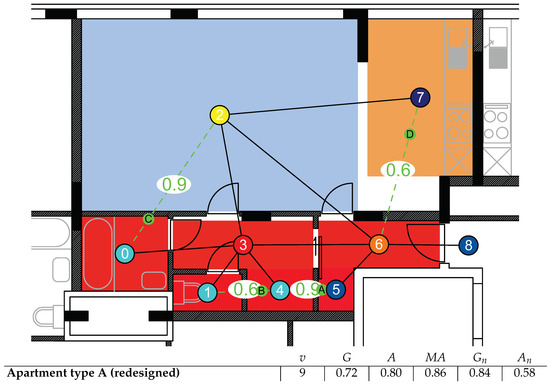 We did not encounter prior studies using weighted plan graphs to directly measure adaptability. However, the basic idea is present in related work. For example, in an early study on the relation between building adaptability and the social use of space, Priemus [21] used weighted adjacency matrices to express and calculate the relationship between and clustering of different functions in a house (e.g. sitting, drinking coffee, doing laundry), with weights representing how closely related functions are. Based on surveys, Priemus also weighted user appreciation for walls with different degrees of permeability to separate these functions [21] (pp. 210–213). The canonical works of Space Syntax contain examples of spatial layouts with multiple possible graphs that represent a change in use: e.g. Hanson’s analysis of the Rietveld-Schröder house [14] (chapter 7), or Hillier and Hanson’s discussion of an Ashanti palace with special passageways for royals [10] (pp. 167–172). More recently, Behbahani et al. [22] used weights to represent characteristics of ‘spatio-visual’ relations between spaces, including the size of wall openings, to inform a discursive grammar method. Eloy [23,24] used JPGs to inform the development of a shape grammar for housing transformation and rehabilitation, with the aim to generate and evaluate alternative plan layouts for housing units that need to be adapted. The methodology included comparing the JPG of an original plan to those of refurbished variants, and labelling graph edges according to wall type (also in relation to their permeability). Several of her recommendations to improve a dwelling’s ‘flexibility’ imply increasing or maintaining the permeability of internal walls.