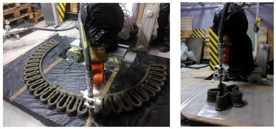 Three printing campaigns that used cementitious matrix formulations were realized. The first campaign used a conventional formulation (Figure 2). The second campaign used a slow-hardening formulation for the cementitious printed material, and the third campaign used a rapid-hardening formulation (Figure 3). All specimens were made under the same printing conditions (same pumping rate, without vibration and shock). The three campaigns are designated as follows: