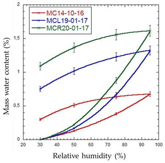 The isotherms of sorption and desorption show the existence of the phenomenon of hysteresis, which reflects the fact that it is easier for water to enter the porous network than to leave it. This is frequently explained by the geometric shape of the pores, with voids being connected by smaller pass sizes. Indeed, the results show that for the MCR20-01-17 tests during the desorption phase, samples keep a mass moisture content equal to 1.1% at RH = 30%. This will lead to deterioration in the durability of this formulation compared with others.