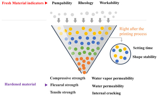 While the three printing campaigns resulted in printed structures, the results reveal different characteristics. This led us to rethink the indicators for 3D-printed materials for construction due to the performance-based approach. Those indicators are associated with fresh, pre-hardened, and hardened material as shown in Figure 8.