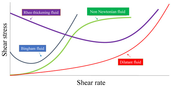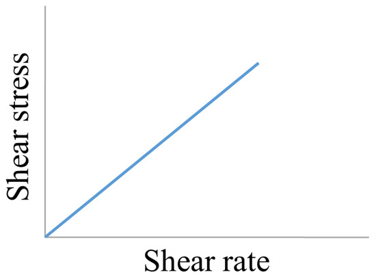 Different categories of fluids exist with the most known being the Newtonian fluids. Regardless of the stress applied, these fluids do not have a shear threshold. Their flow is proportional to the stress and keeps a constant viscosity as shown in Figure 9.