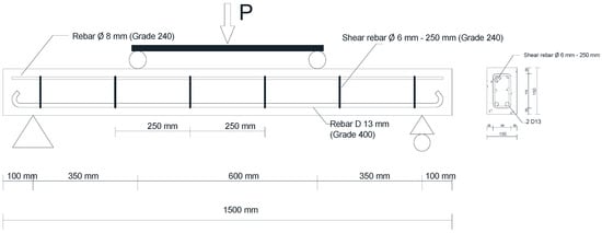 All the test beams were 100 mm wide and had an overall depth of 150 mm. The total length of each beam was 1500 mm. Three beams were tested for each series. Two 13 mm diameter of rebar Grade 400 were used as tension reinforcement whereas an 8 mm diameter of rebar Grade 240 with a spacing of 250 mm was used as shear reinforcement for the two series. Figure 1 shows the geometry and reinforcement details of the GCB.